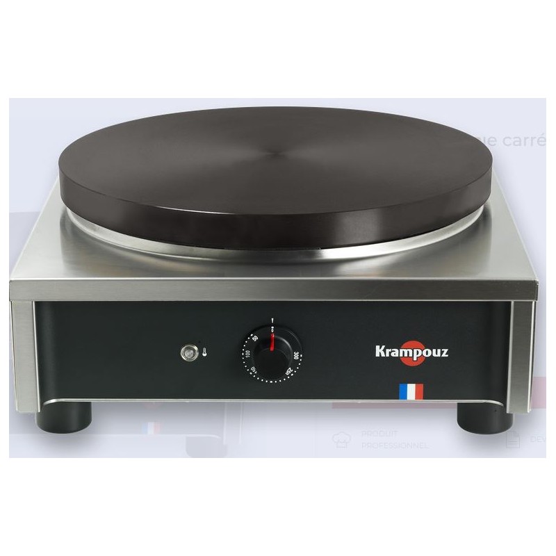 La conception exclusive de la plaque, dans laquelle sont insérées les résistances perlées, offre une grande précision et une homogénéité de chauffe. La manette de contrôle, développée sur mesure pour être plus robuste et plus résistante à l’arrachement, est graduée de 50 à 300°C permettant un réglage précis de la température. Très résistante, la plaque en fonte brute usinée ne craint pas les chocs. Le châssis carré permet de limiter les coulures de pâte et les salissures sur le plan de travail. Énergie Électrique Plaque Fonte usinée Puissance 3 600 W Poids 16 KG Dimensions 40 x 40 × 20 cm Diamètre ø 40 cm Gamme Confort Utilisation Intensive Forme du châssis Carré Matériau châssis Inox Tensions 400 V Régulation Thermostat réglable de 50 à 300°C Nombre de résistances par plaque 2 ou 3 résistances en serpentin garantissant une diffusion uniforme de la chaleur Utilisation Intérieur - Extérieur Témoin Témoin de chauffe, s'éteint lorsque la température est atteinte Mise en marche Interrupteur marche/arrêt intégré à la manette de contrôle